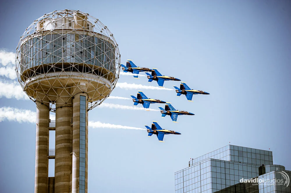 The US Navy Blue Angels soaring through the Downtown Dallas, against the backdrop of the iconic Reunion Tower.