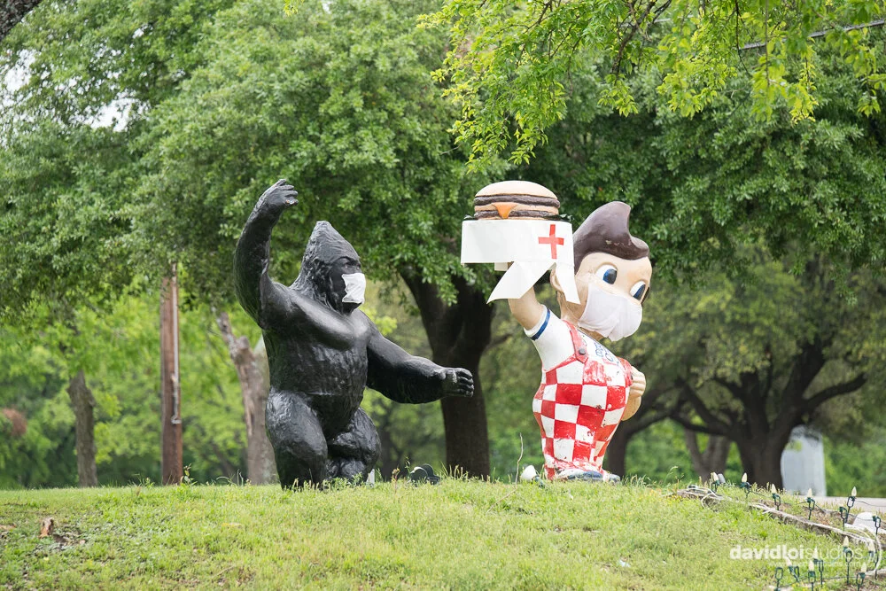 Big Boy & King Kong wearing masks and exemplifying Social Distancing in Dallas, TX.