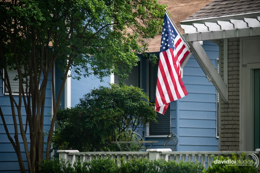 An American flag is proudly displayed in front of a house in Dallas, TX
